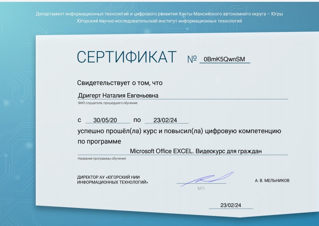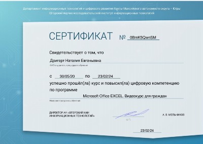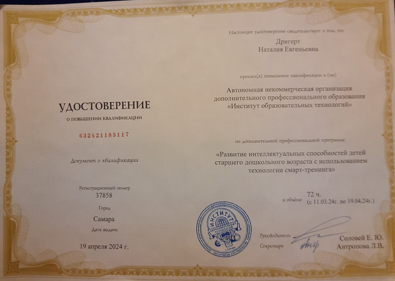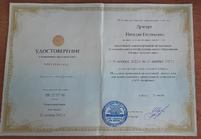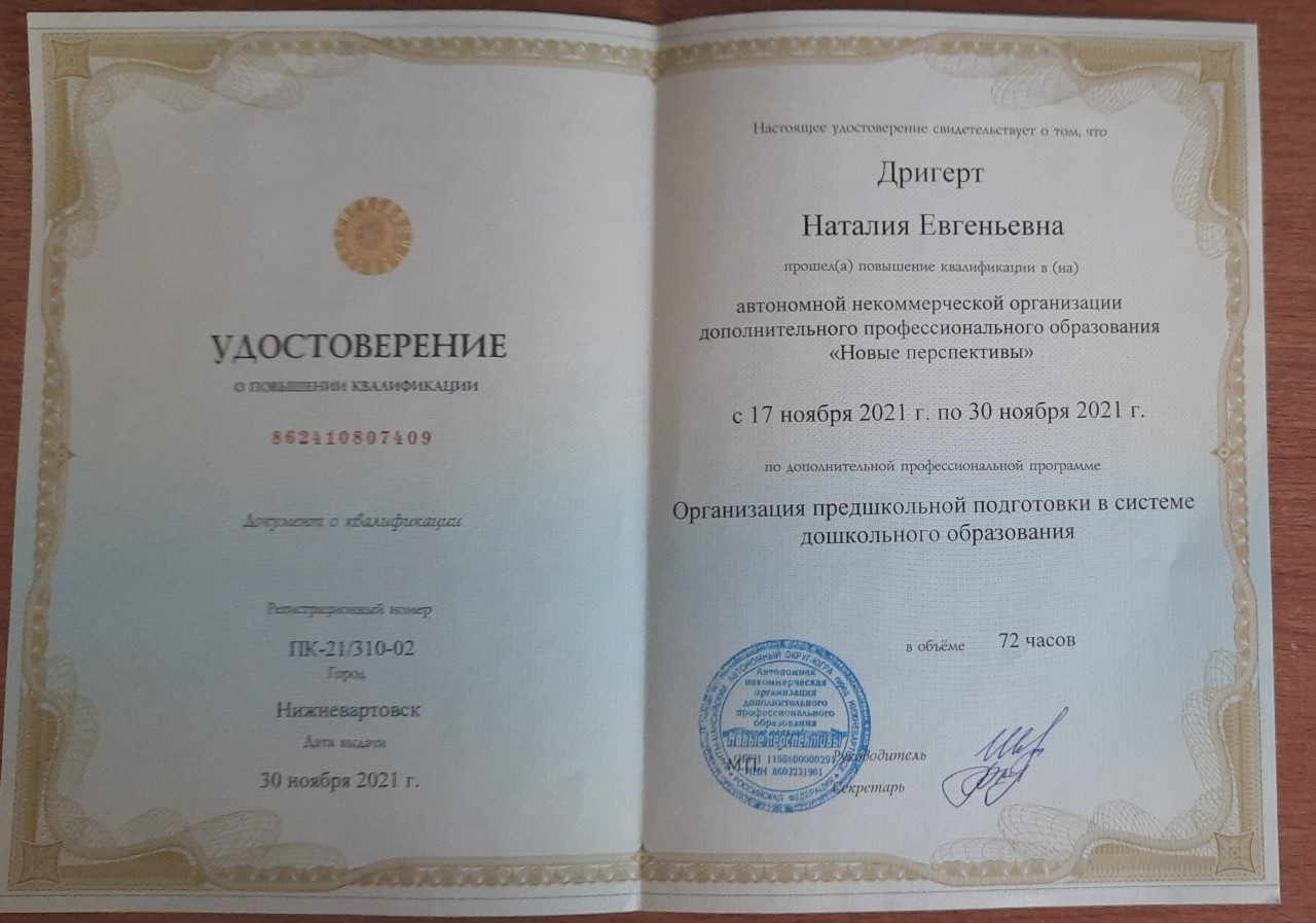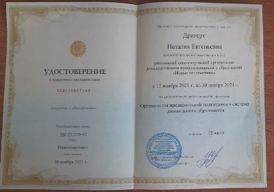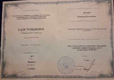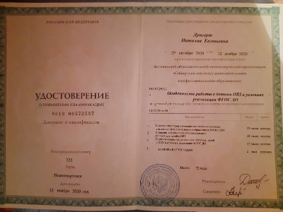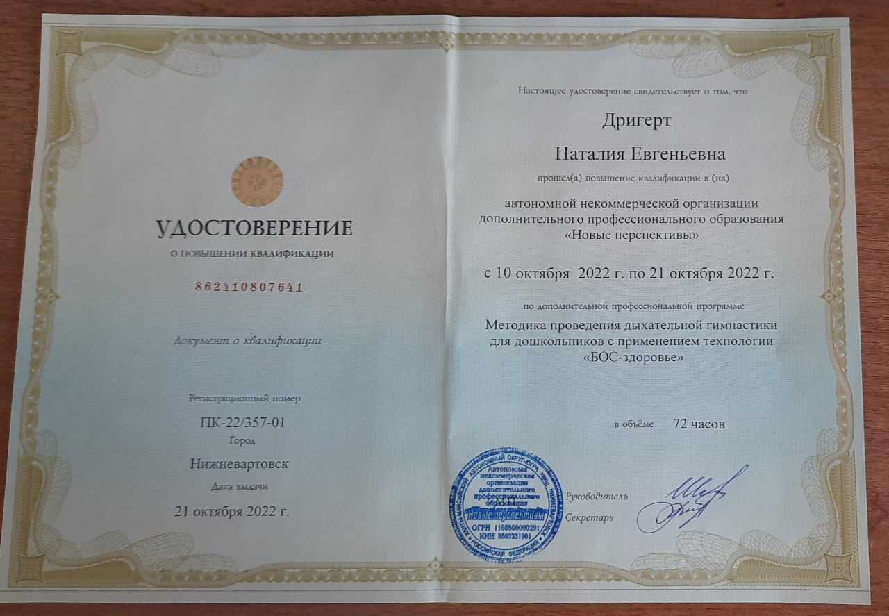 2019г. - КПК "Методика проведения дыхательной гимнастики для дошкольников с применением технологии "БОС -Здоровье", АНО ДПО "Новые перспективы", 72 ч. просмотр