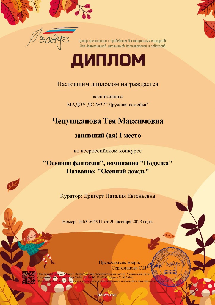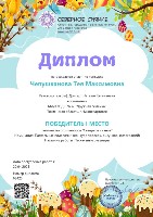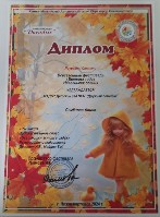 Диплом 1 место, Всероссийский конкурс "Осенняя фантазия", номинация "Поделка", Чепушканова Т., окт.2023г. |
