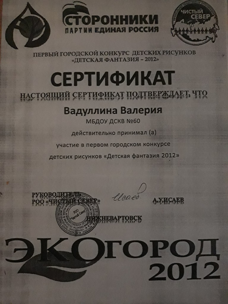 Сертификат участника, Первый Городской конкурс детских рисунков "Детская фантазия 2012", 2012 г., Вадуллина В. заочно |