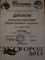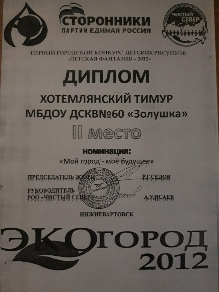 Диплом, 2 место, Первый Городской конкурс детских рисунков "Детская фантазия 2012", номинация "Мой город -моё будущее", 2012г., Хотемлянский Т. заочно |