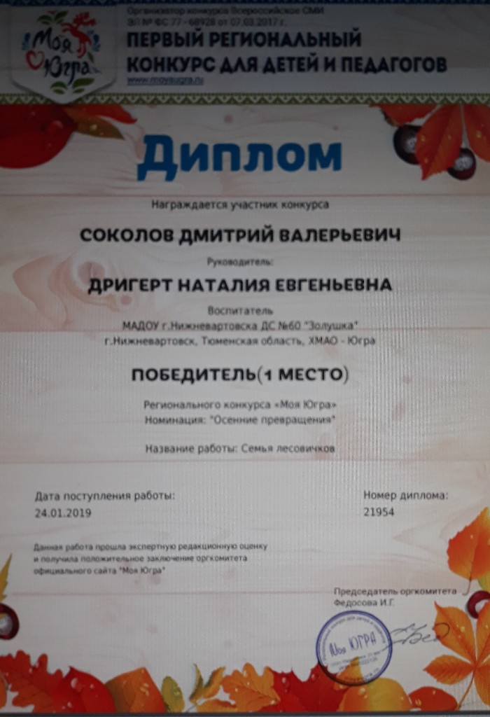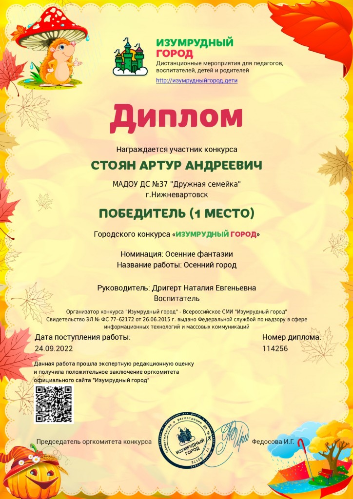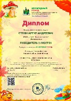Диплом 1 место Городской конкурс "Изумрудный город", номинация "Осенние фантазии", 2022г., Стоян А. заочно |