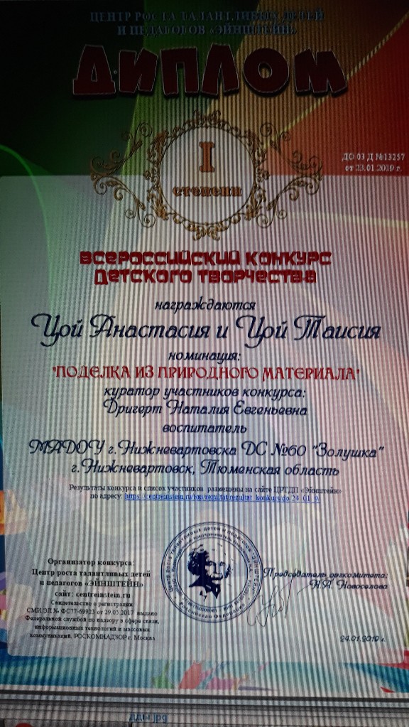 Диплом 1 степени, Всероссийский конкурс детского творчества, номинация "Поделка и з природного материала", 2019г.