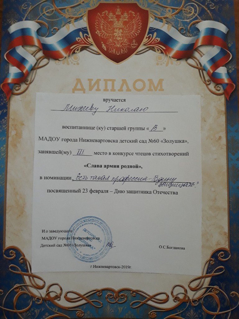Диплом, 3 место, конкурс чтецов стихотворений в ДОУ "Слава армии родной, 2019 г., Михеев К. |