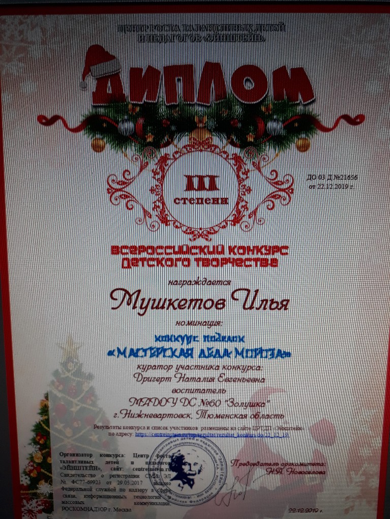 Всероссийский конкурс детского творчества, конкурс поделок "Мастерская Деда Мороза", 2019г., Мушкетов И. |