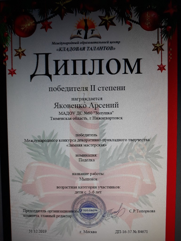 Диплом победителя II степени, Международный конкурс декоративно -прикладного творчества "Зимняя мастерская", 2019г., Яковенко А. |