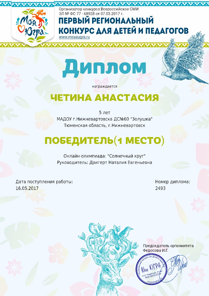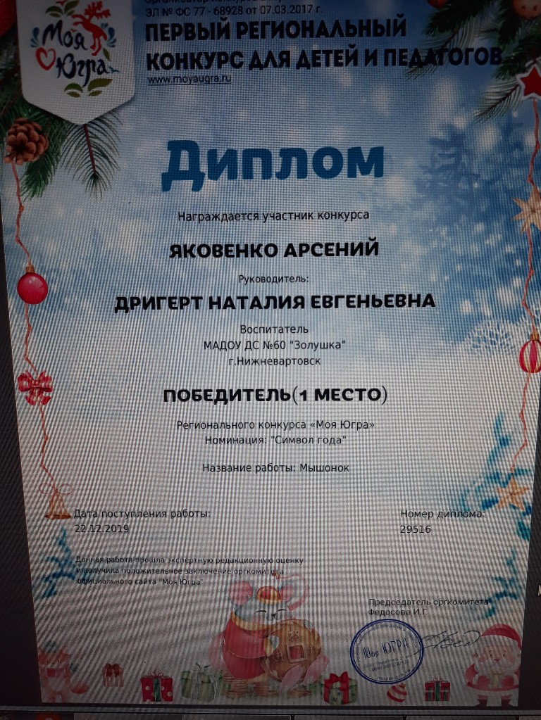 Диплом, 1 место, Региональный конкурс "Моя Югра", Номинация "Символ года", 2019г.,Яковенко А. |