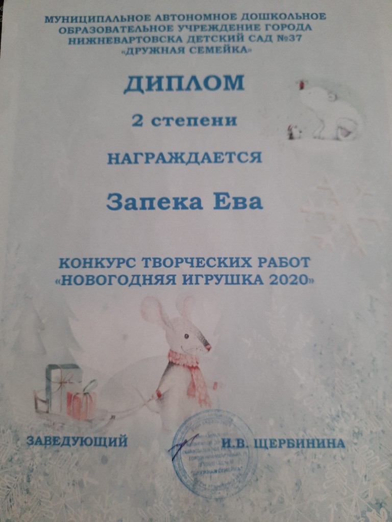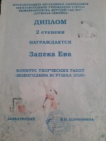 Диплом 2 степени, Конкурс творческих работ в ДОУ "Новогодняя игрушка 2020", Номинация "Оригинальная игрушка",Запека Е. |