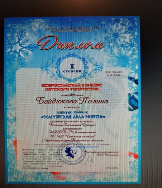 Всероссийский конкурс детского творчества, конкурс поделок "Мастерская Деда Мороза", 2020г.,Байдюкова П. |