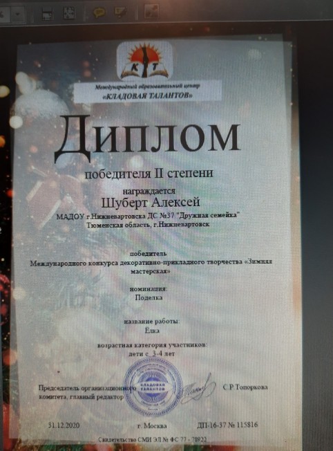 Международный конкурс декоративно-прикладного творчества "Зимняя мастерская, номинация "Поделка, 2020г., Шуберт А. |