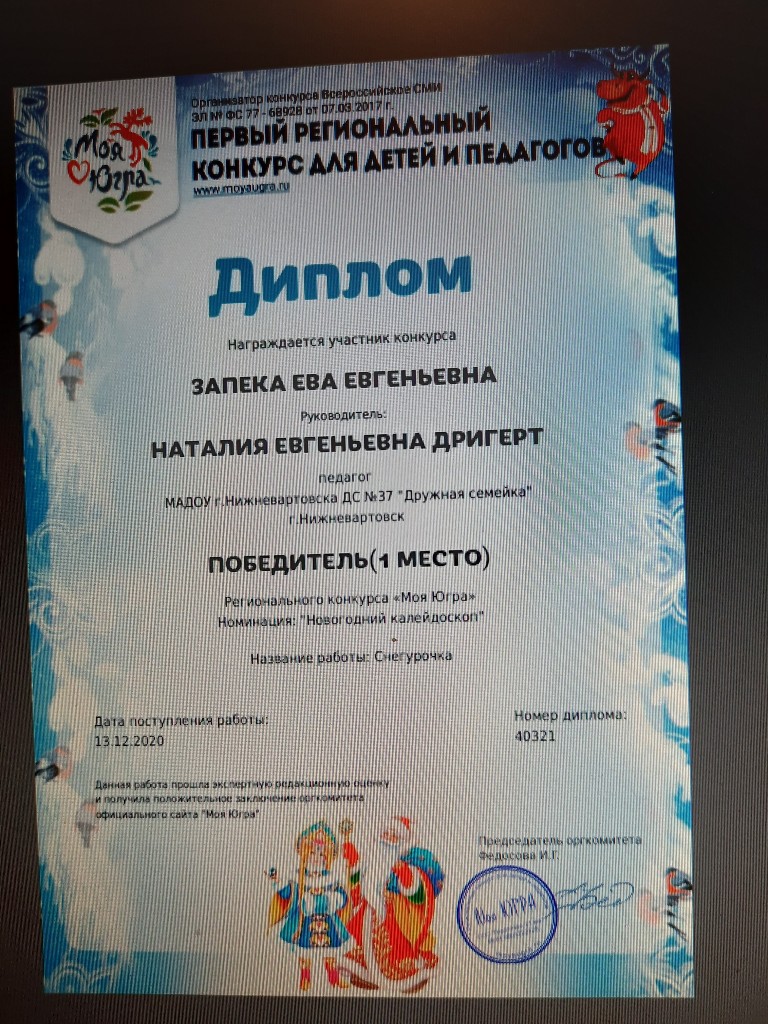 Диплом, 1 место, Региональный конкурс "Моя Югра", Номинация "Новогодний калейдоскоп", 2020г., Запека Е. |
