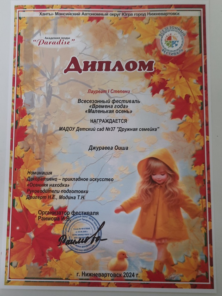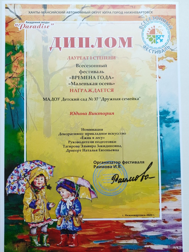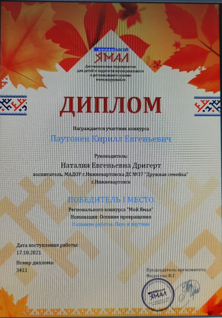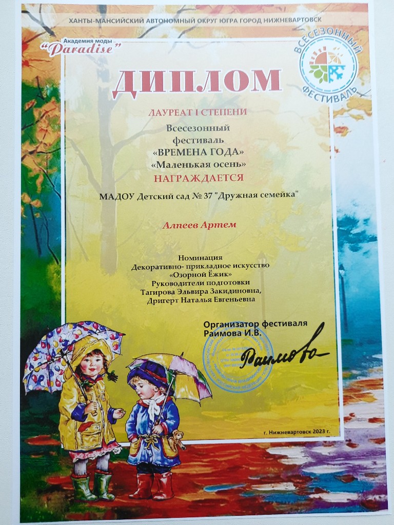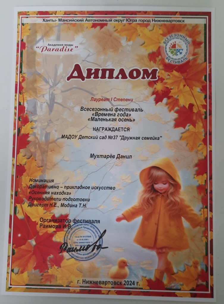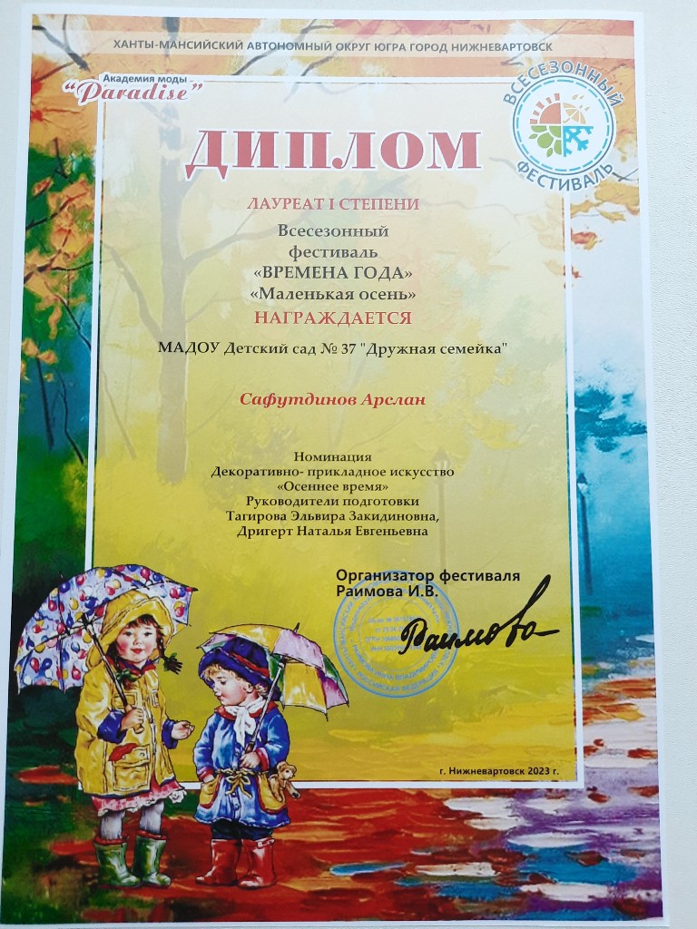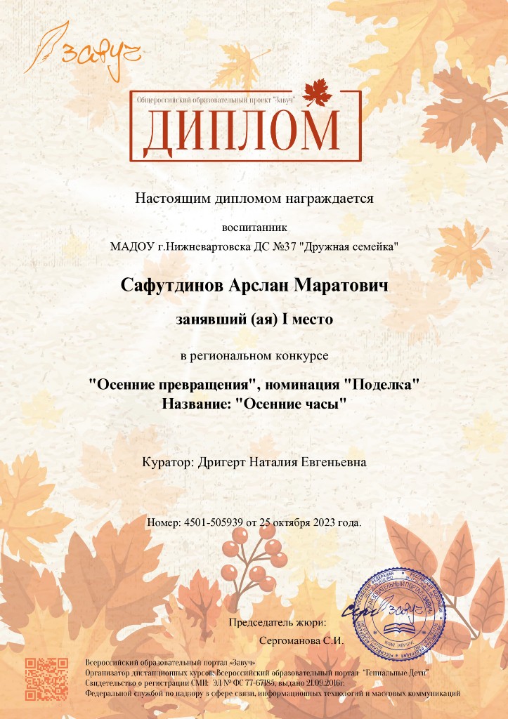 Диплом 1 место, Региональный конкурс "Осенние превращения", номинация "Поделка", Сафутдинов А., окт 2023г |