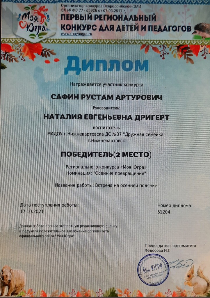 Диплом, 2 место, Региональный конкурс "Моя Югра", Номинация "Осенние превращения", 2021г., Сафин Р. |