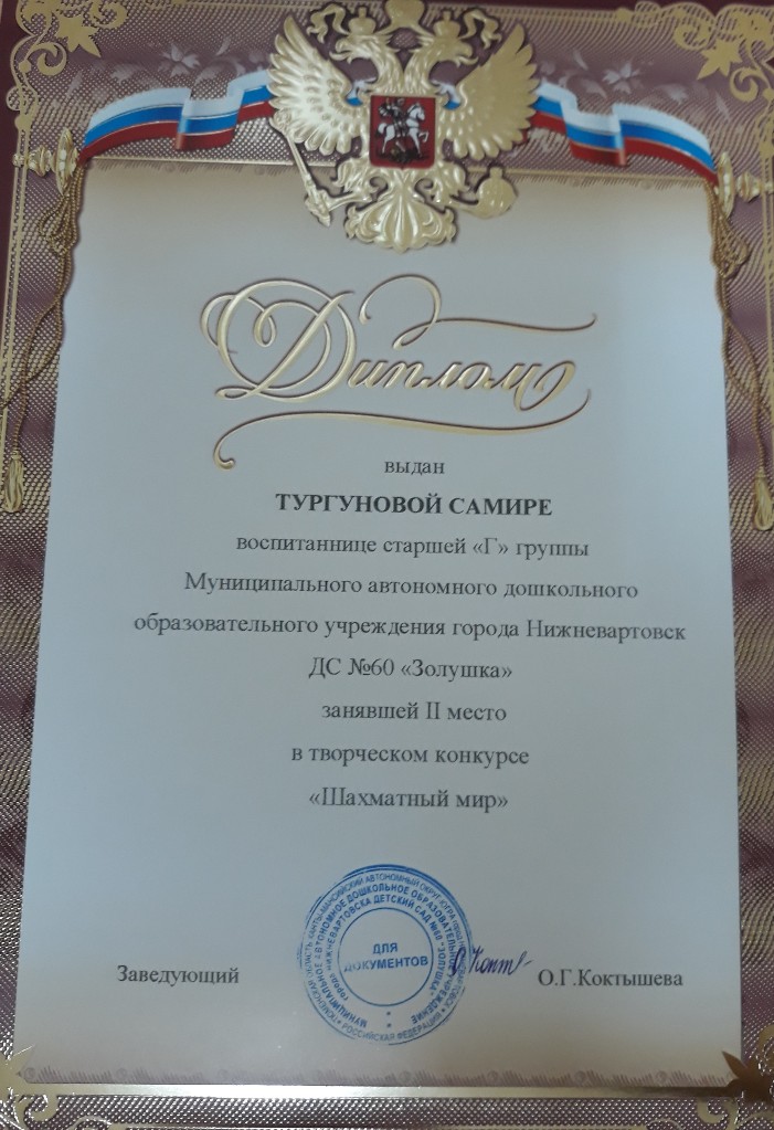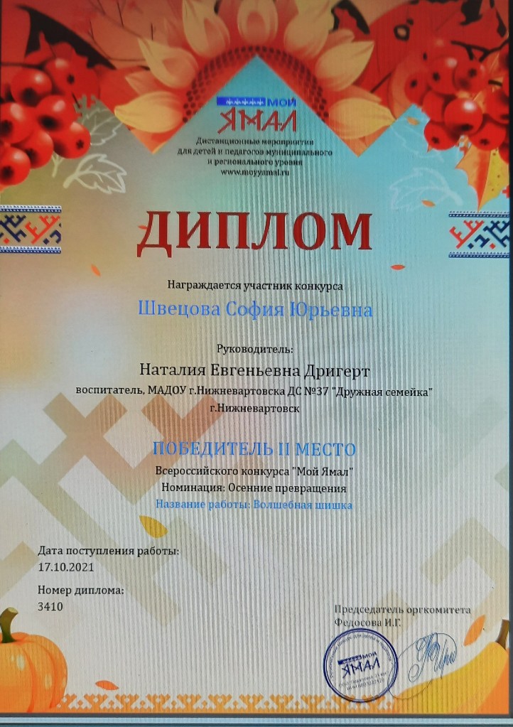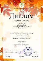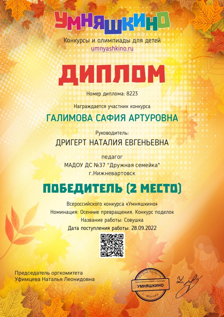 Диплом 2 место, Всероссийски конкурс "Умняшкино", номинация "Осенние превращения", 2022г., Галимова С. |