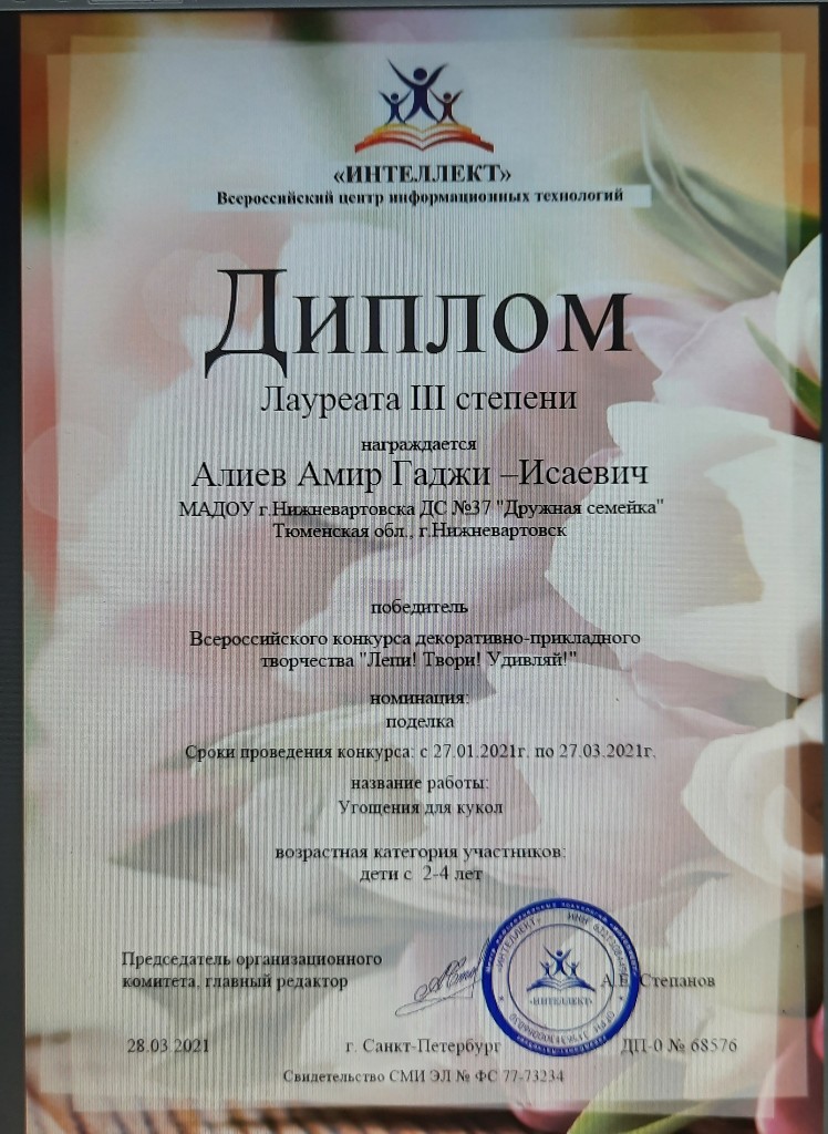 Диплом лауреата III степени, Всероссийский конкурс декоративно -прикладного творчества "Лепи! Твори! Удивляй", Номинация "Поделка", 2021г., Алиев А. |