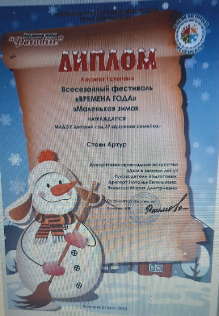 Диплом лауреата 1 степ., Всесезонный Городской фестиваль "Маленькая зима", 2023г. Стоян А. очно |