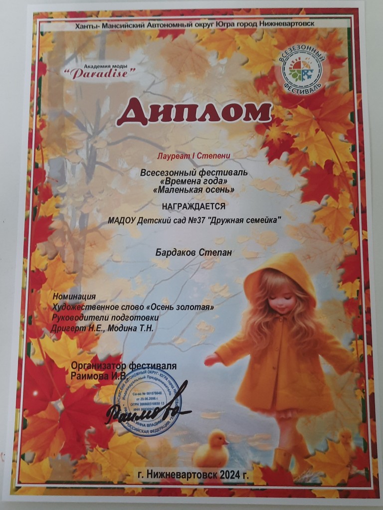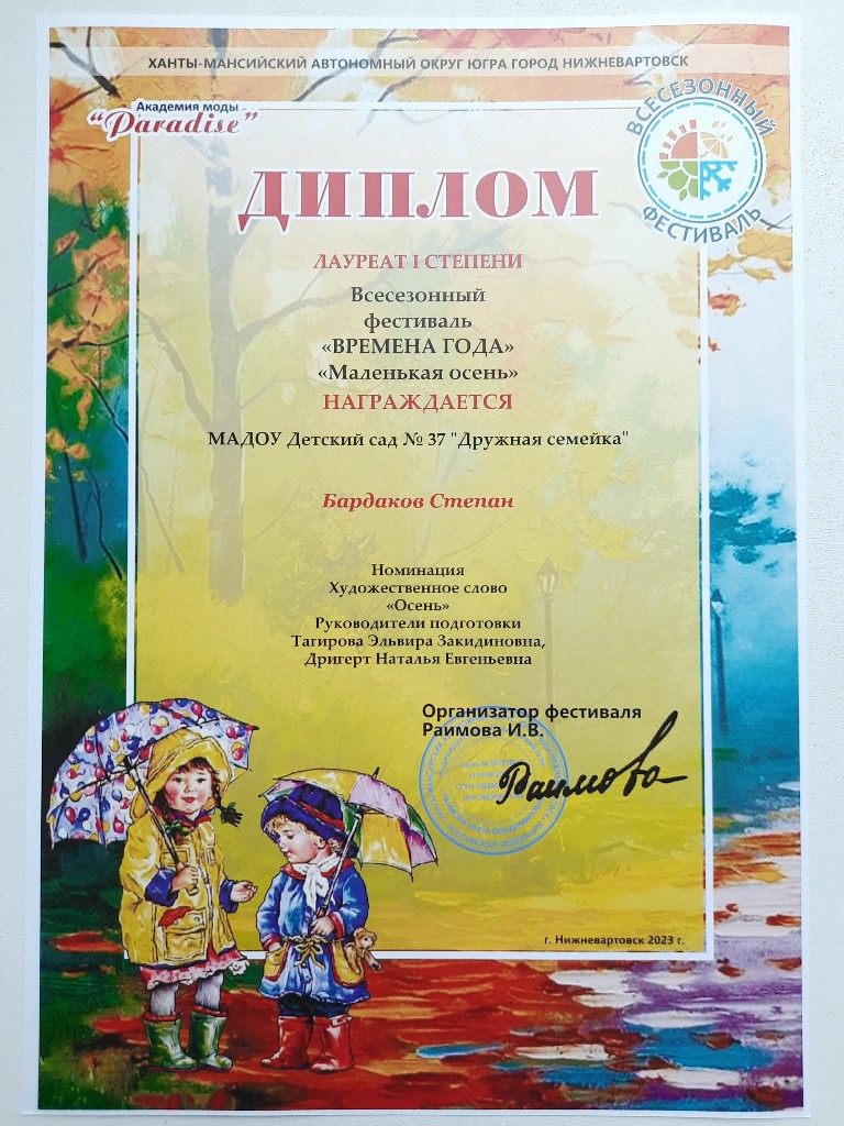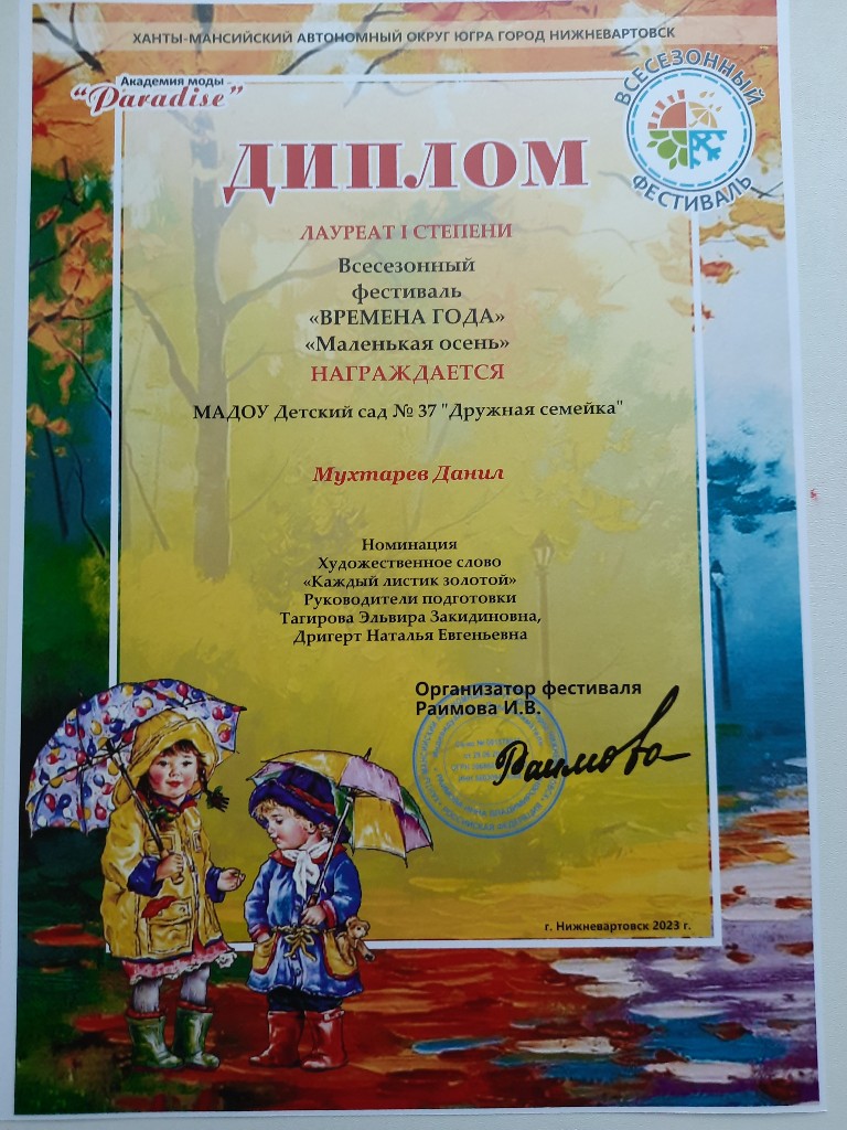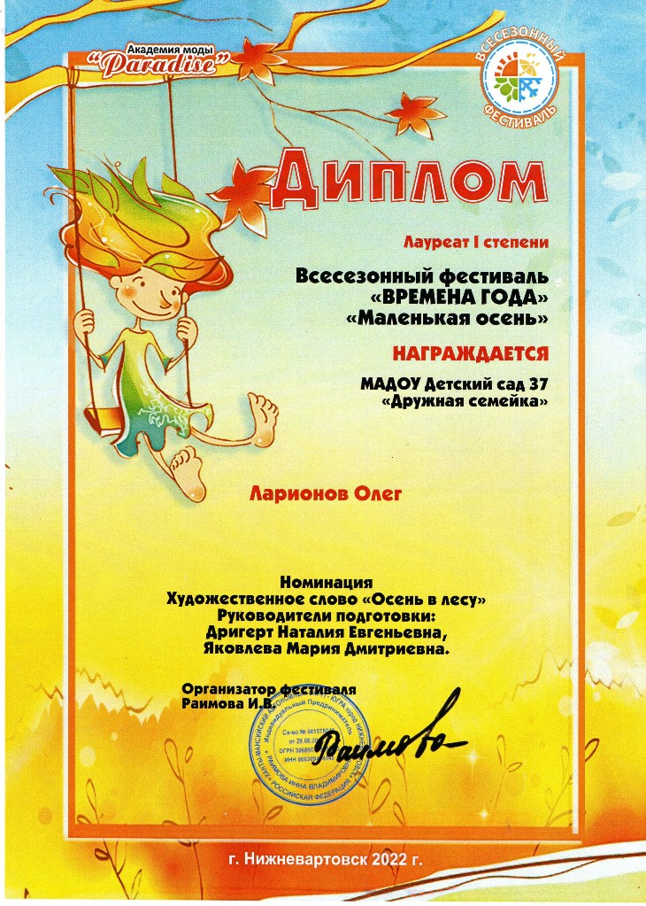 Диплом лауреата 2 степ.,Всесезонный Городской фестиваль "Маленькая осень", окт.2022г. Ларионов О. очно |