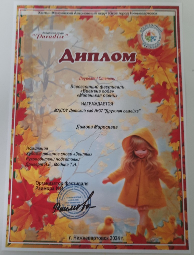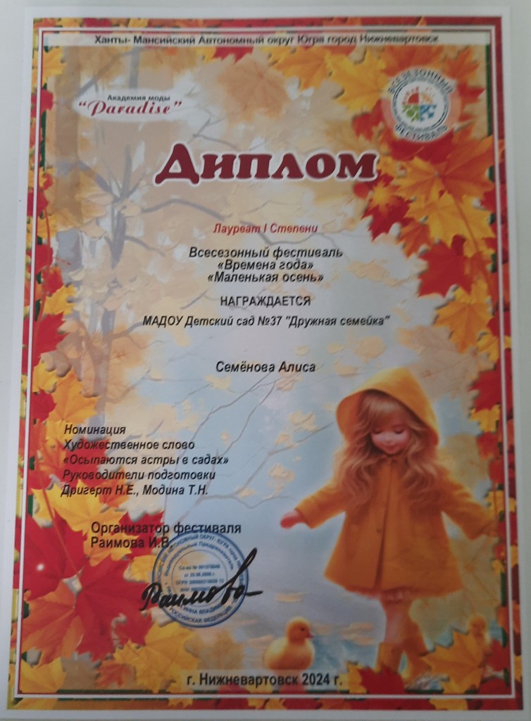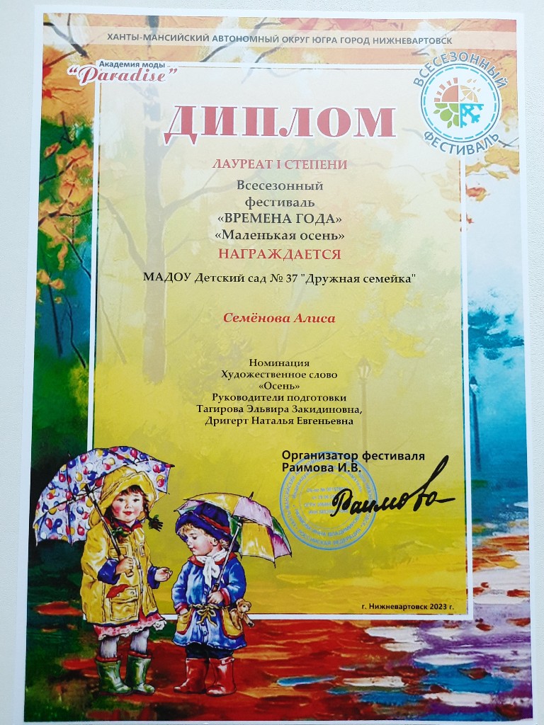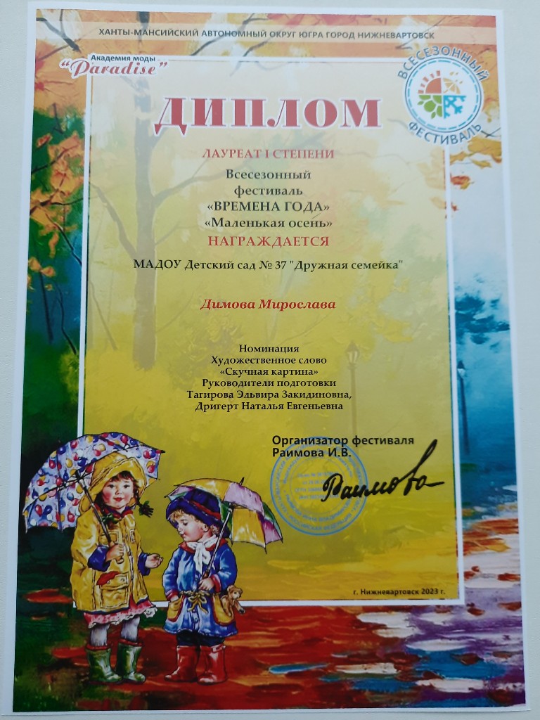 Диплом лауреата 2 степ.,Всесезонный Городской фестиваль "Маленькая осень", окт.2022г. Ларионов О. очно |