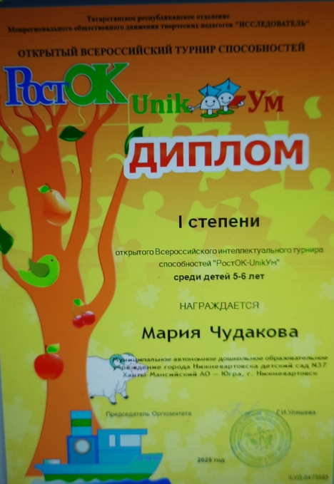 Диплом I степени, Всероссийский интеллектуальный турнир способностей "РостОК-UnikУм"среди детей 5-6 лет, Чудакова М., 2025г., очно |