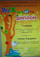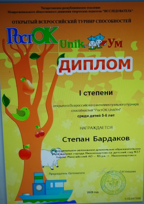 Диплом I степени, Всероссийский интеллектуальный турнир способностей "РостОК-UnikУм"среди детей 5-6 лет, Бардаков С., 2025г., очно |