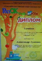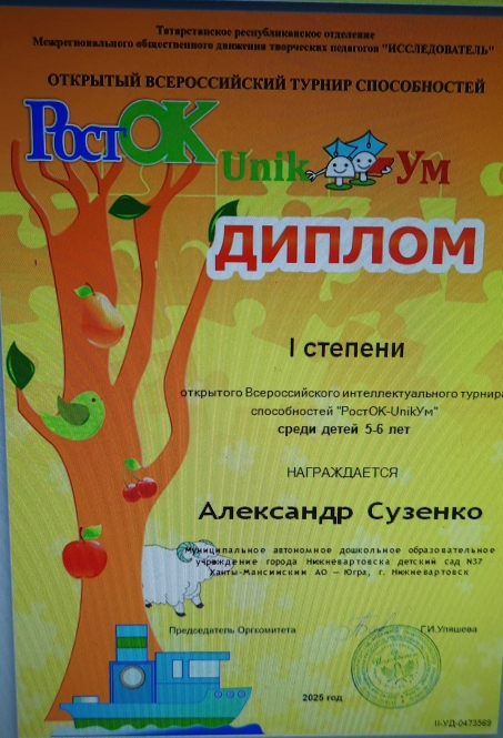 Диплом I степени, Всероссийский интеллектуальный турнир способностей "РостОК-UnikУм"среди детей 5-6 лет, Сузенко А., 2025г., очно |
