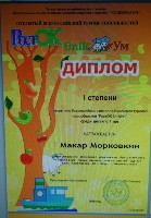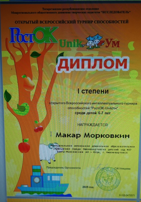 Диплом I степени, Всероссийский интеллектуальный турнир способностей "РостОК-UnikУм"среди детей 6-7 лет, Морковкин М., 2025г., очно |
