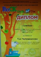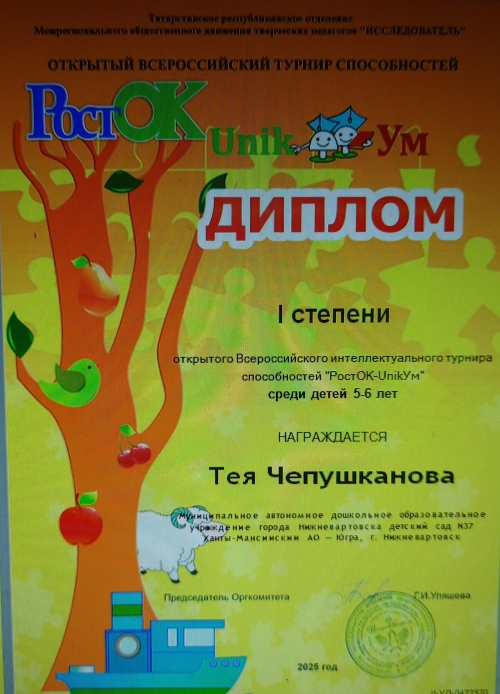 Диплом I степени, Всероссийский интеллектуальный турнир способностей "РостОК-UnikУм"среди детей 5-6 лет, Чепушканова Т., 2025г., очно |