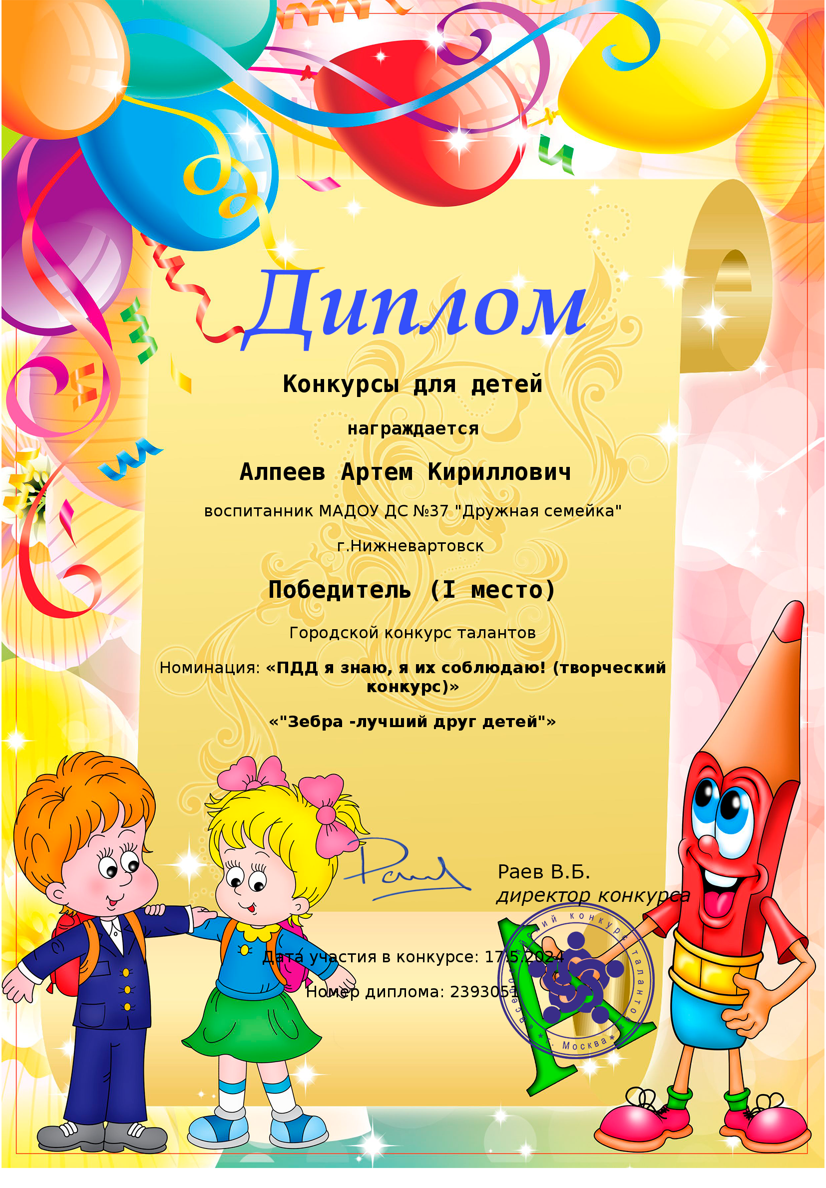 Диплом победителя 1 место, Городской конкурс талантов по пдд, Алпеев А., янв. 2024г., заочно |