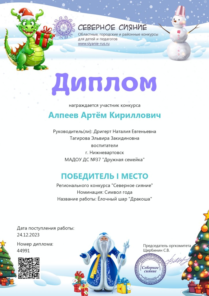 Региональный конкурс "Северное сияние", номинация "Символ года", Алпеев А., дек.2023г. |