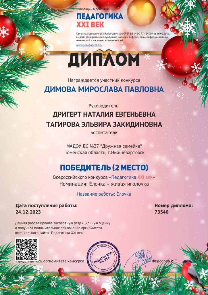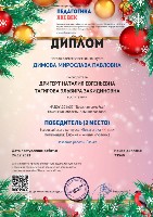 Диплом победителя II место,Всероссийский конкурс, номинация "Елочка-живая иголочка", Димова М., дек.2023г. |