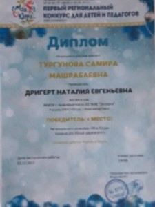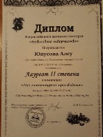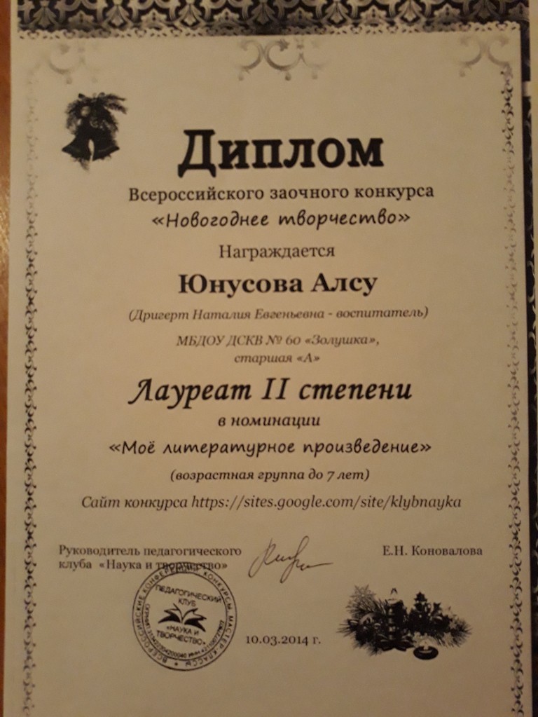 Диплом лауреата II степени, Всероссийский конкурс "Новогоднее творчество", 2014г. Юнусова А. |