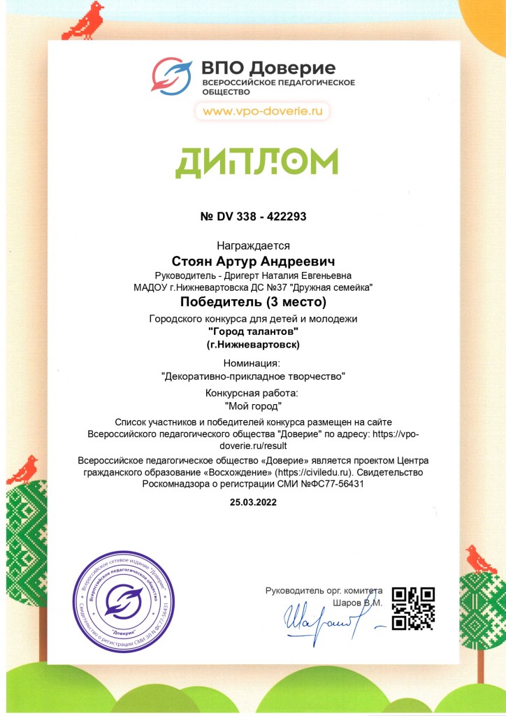 Диплом, 3 место, Городской конкурс "Город талантов", Номинация "декоративно -прикладное творчество, 2022г. Стоян А. заочно |
