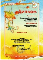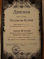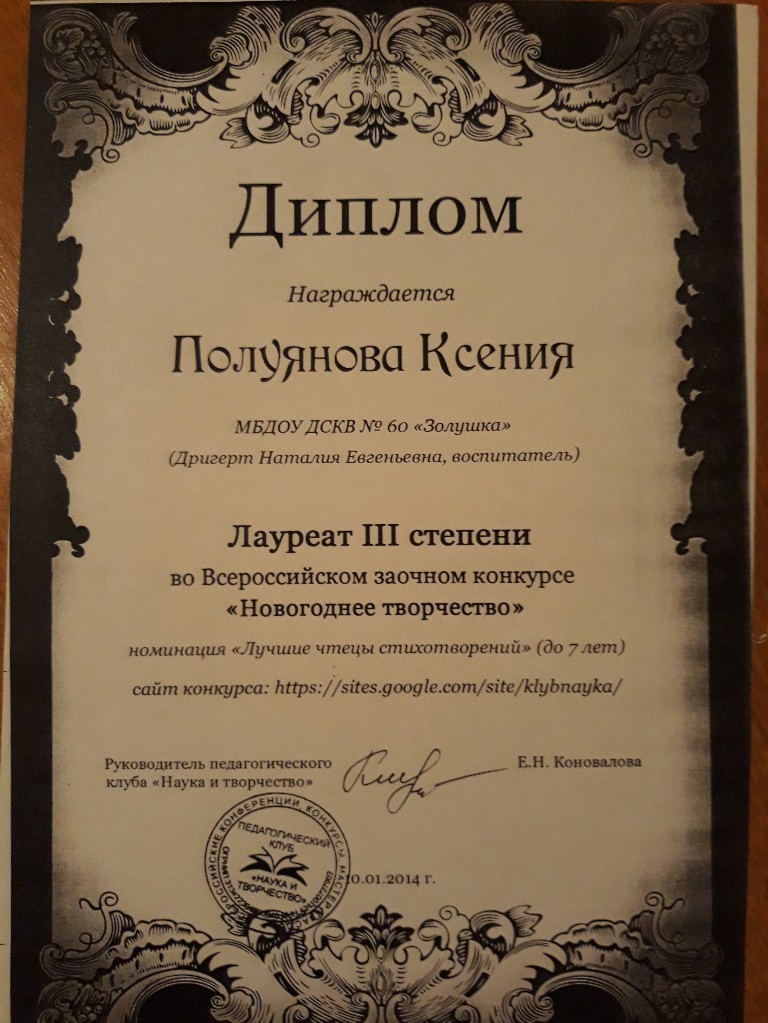 Диплом лауреата III степени, Всероссийский конкурс "Новогоднее творчество", 2014г. Полуянова К. |