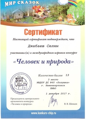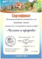Диплом, 1место, Международный конкурс "Человек и природа", 2017г., Джабаев С. |
