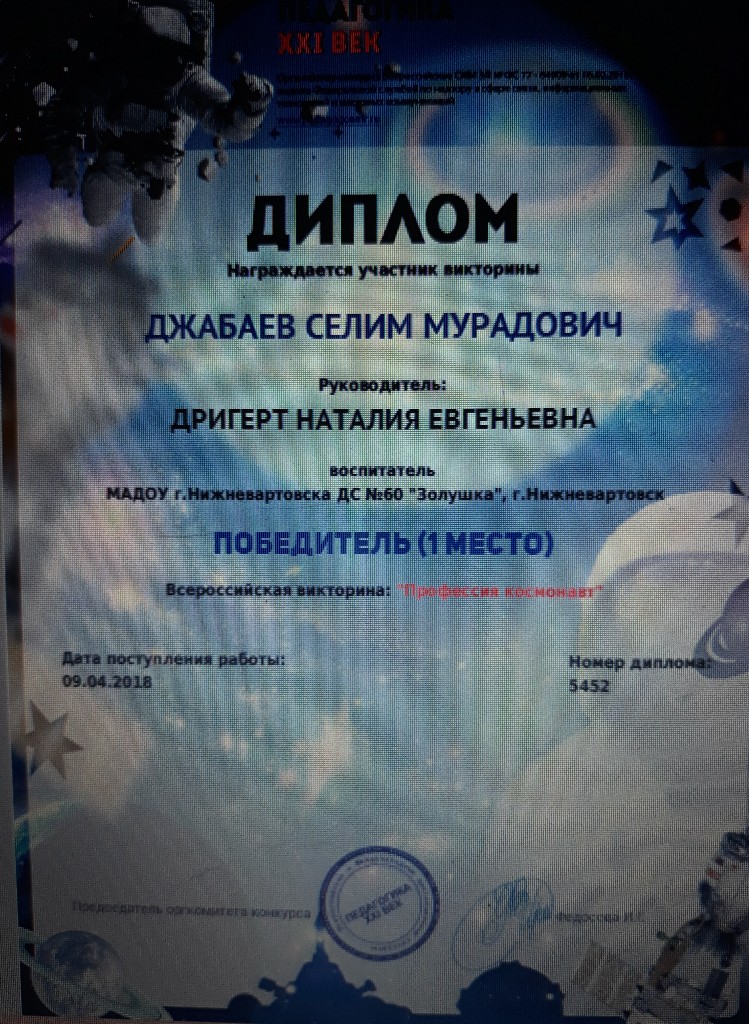 Диплом, 1 место, Всероссийская викторина "Профессия космонавт", 2018г., Джабаев С. |