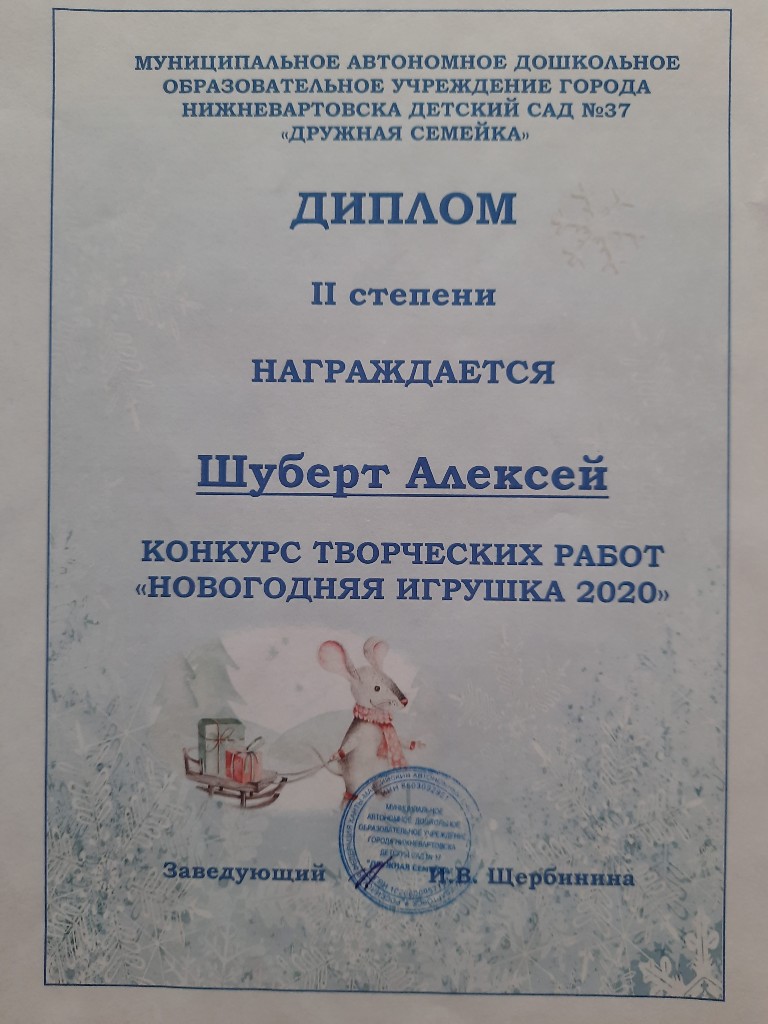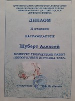 Диплом 2 степени, Конкурс творческих работ в ДОУ "Новогодняя игрушка 2020", номинация "Ёлка", Шуберт А. |