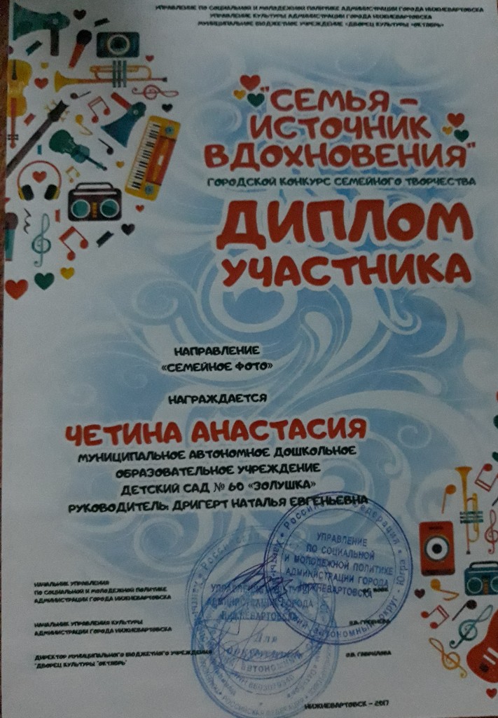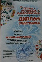 Диплом участника, Городской конкурс "Семья-источник вдохновения", 2017г. Четина А. очно |