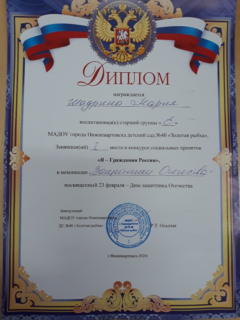 Диплом, 1 место, Конкурс социальных проектов в ДОУ "Я-гражданин России", 2020г., Шадрина М. |