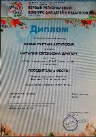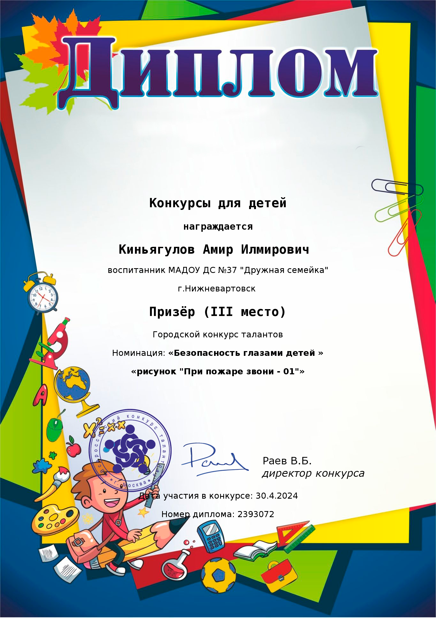 Диплом победителя 3 место, Городской конкурс талантов Номинация "Безопасность глазами детей", Киньягулов Амир,апр.2024г. заочно |