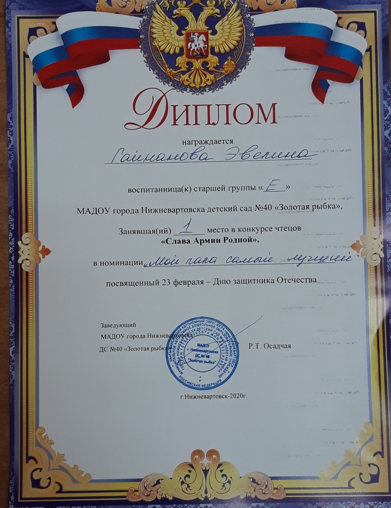 Диплом,1 место, Конкурс чтецов стихотворений в ДОУ "Слава армии родной", 2020г., Гайнанова Э. |