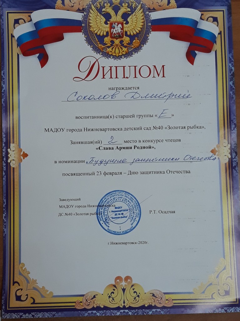Диплом, 2 место, Конкурс чтецов стихотворений в ДОУ "Слава армии родной", 2020г., Соколов Д. |