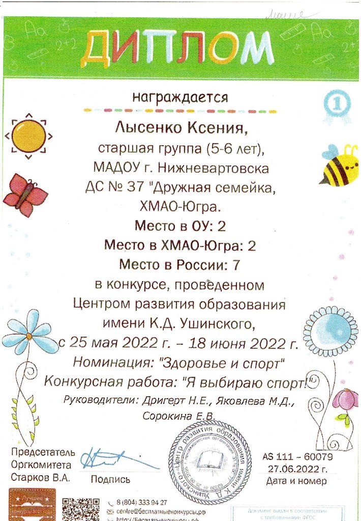 Конкурс Центра развития образования имени К.Д.Ущинского, номинация "Здоровье и спорт", 2022г. Лысенко К. |