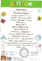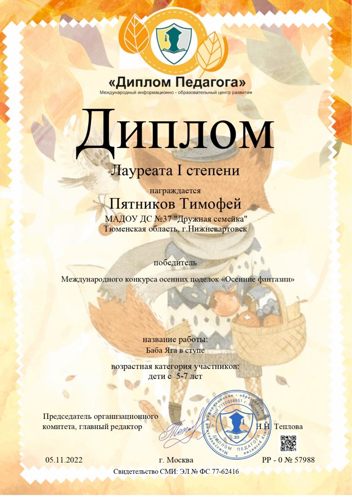 Диплом лауреата 1 степ., Международный конкурс осенних поделок "Осенние фантазии", Пятников Т., 2022г. |