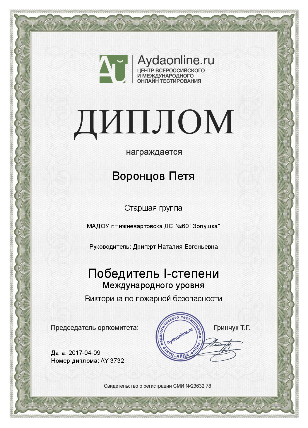 Диплом I степени,