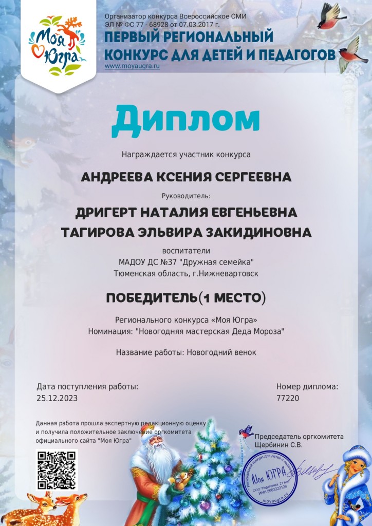Диплом, 1 место, Региональный конкурс "Моя Югра", номинация "Новогодняя мастерская Деда Мороза", Андреева К., дек.2023г. |