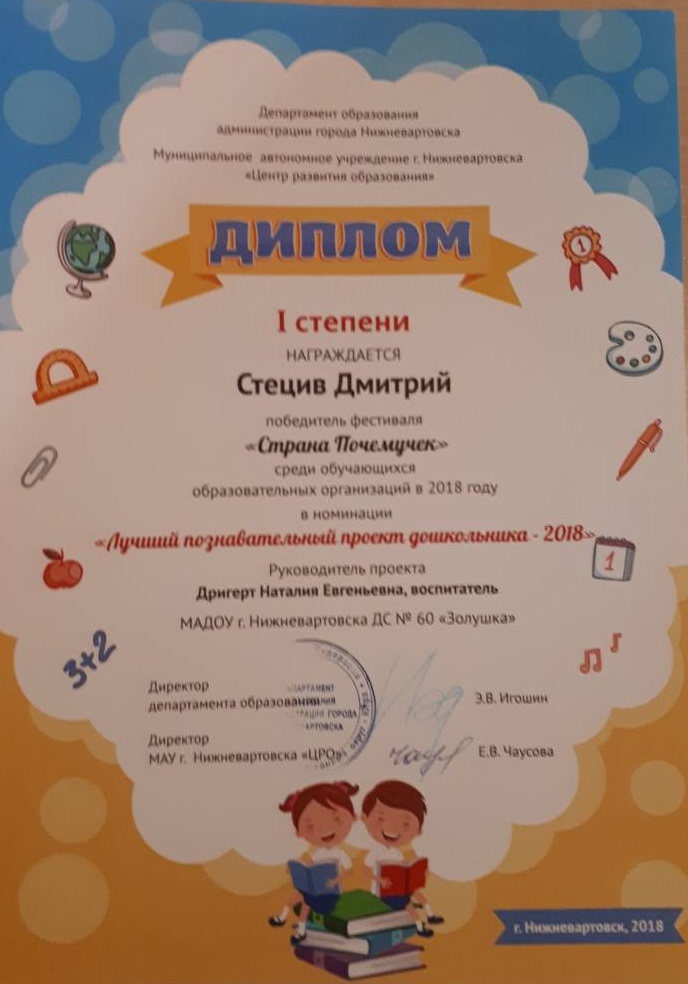 Диплом 1 степени, Городской фестиваль очно "Страна Почемучек", 2018г., Стецив Д. |