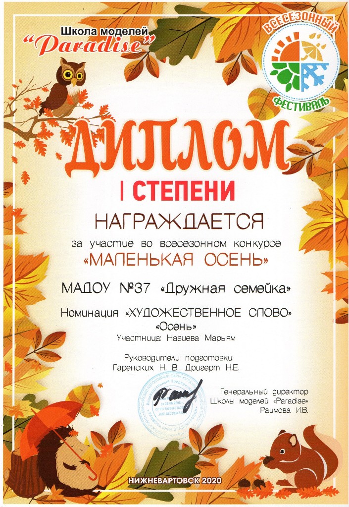 Муниципальный всесезонный конкурс "Маленькая осень" , Номинация "Художественное слово", 2020г., Нагиева М. |