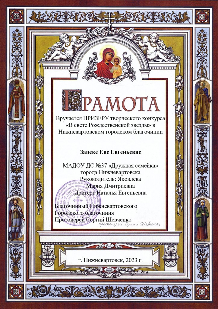 Грамота, Призер городского творческого конкурса "В свете рождеств.звезды", янв.2023г., Запека Е. заочно |