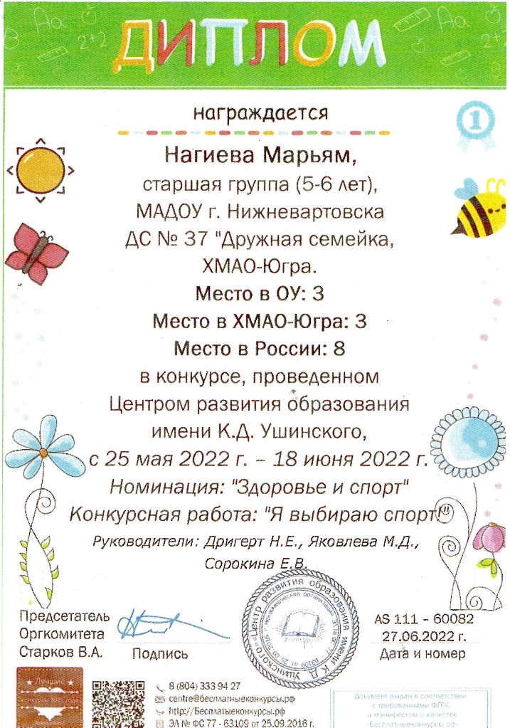 Конкурс Центра развития образования имени К.Д.Ущинского, номинация "Здоровье и спорт", 2022г. Нагиева М. |