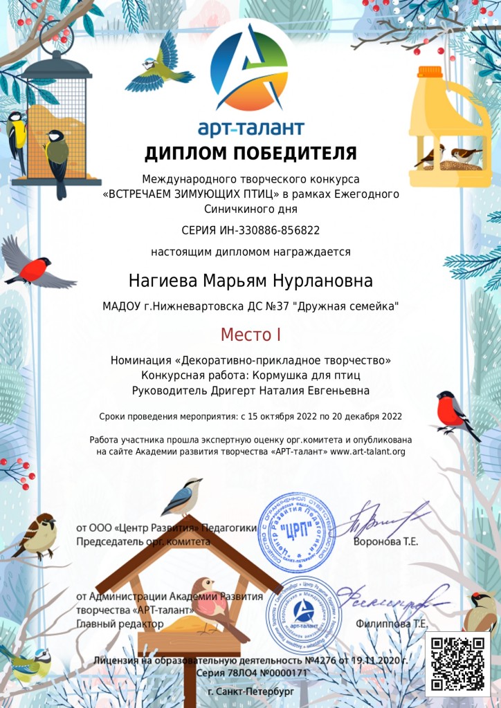 Диплом, 1 место, Международный творч.конкурс "Встречаем зимующих птиц", 2022 г. ,Нагиева М. |