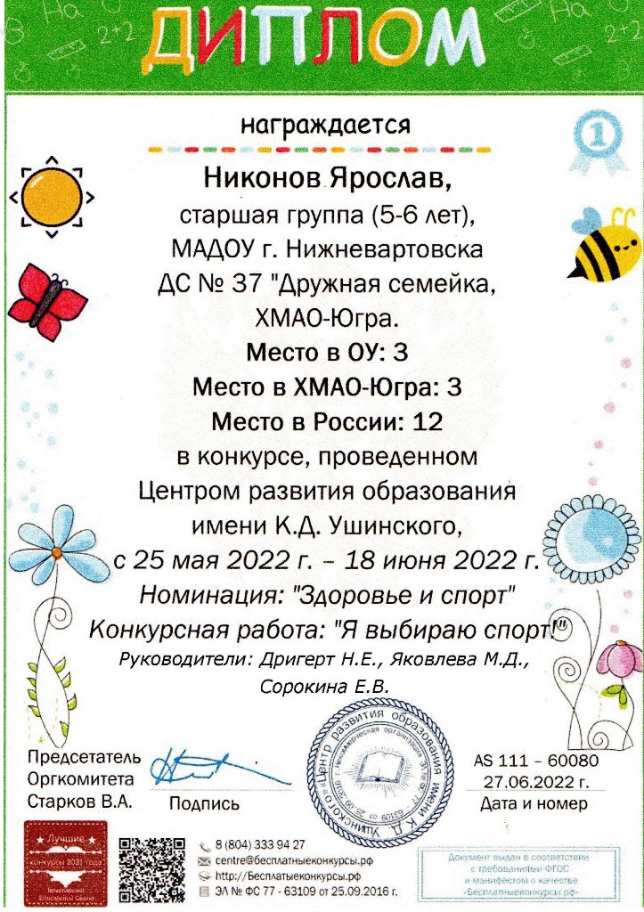 Конкурс Центра развития образования имени К.Д.Ущинского, номинация "Здоровье и спорт", 2022г. Никонов Я. |